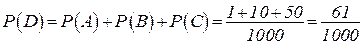 Пример. В лотерее 1000 билетов: 1б. – 500 грн; 10 б. – 100 грн; 50 б. – 20 грн; 100 б. – 5 грн. Найти вероятность выиграть не менее 20 грн на приобретенный наудачу билет.