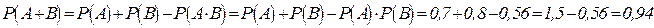 Пример: Вероятность попадания в цель при стрельбе из первого и второго орудий Р1 = 0,7; Р2 = 0,8. Найти вероятность попадания в цель при одном залпе хотя бы одним из орудий.