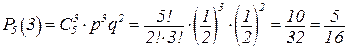 2) Монету бросаем 5 раз. Найти вероятность того, что герб выпадет 3 раза. n = 5; k = 3; A: выпадение герба;