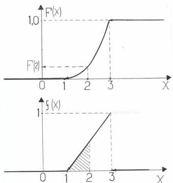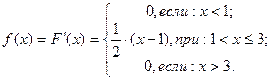 , эта площадь всегда становится равной 1. в данном примере график плотности распределения имеет одну точку разрыва первого рода при х = 3. Заштрихованная на нём площадь численно равна вероятности попадания случайной точки на указанный промежуток.
