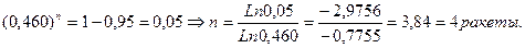 . Тогда число пущеных ракет, обеспечивающих заданную вероятность поражения судна, найдём из соотношения: 0,95=1-(0,460)n, откуда: