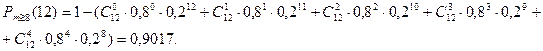 5.2 На автобазе имеется 12 автомашин. Вероятность выхода на линию каждой из них равна 0,8. найти вероятность нормальной работы автобазы, если для этого необходимо иметь на линии не менее 8 автомашин.