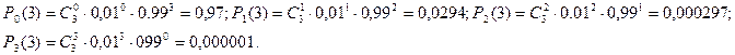 Случайная величина Х – число судов с испорченным грузом, её возможные значения равны: 0; 1; 2; 3. Подсчитаем вероятности этих значений. Закон распределения – биномиальный, с параметрами: р = 0,01; q = 0,99.