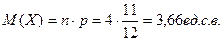 Случайная величина Х – число станков, работающих в данный момент времени. Её возможные значения: 0; 1; 2; 3; 4. Каждый станок пребывает в двух состояниях: рабочем, вероятность такого состояния р равна отношению временного промежутка, когда он работает, к всему рабочему времени р= 5,5час/6час= 11/12; нерабочем, вероятность этого состояния q = 0,5час./6час.=1/12.