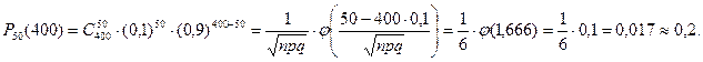 5.6 При массовом производстве полупроводниковых диодов вероятность брака при формовке равна 0.1. Какова вероятность того, что из 400 взятых наугад диодов 50 будут бракованными? (n=400; p=0,1; q=0,9; m=50).