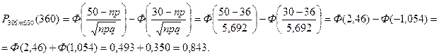 5.9 Вероятность загорания леса от удара молнии во время отдельной грозы равна 0,1. За лето над лесом возникает в среднем 360 гроз. а) Какова вероятность возникновения от 30 до 50 очагов пожара? б) Каково наивероятнейшее число возникающих от гроз очагов возгорания и какова его вероятность?