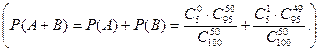 Определить вероятность того, что партия в 100 изделий, среди которых 5 бракованных, будет поринята при проверке, если условиями приёмки допускается не более одного бракованного изделия из 50 пороверенных?