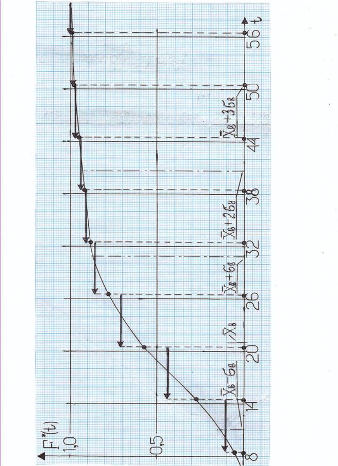 , построенный с использованием первой и четвёртой колонки таблицы 5 (ступенчатая линия). Кумулятивный график построен с использованием первой и пятой колонки таблицы 5 (непрерывная кривая, проходящая через средние точки «ступеней»). Этот график даёт представление о неизвестной функции распределения случайной величины Т. Для дальнейшего анализа выборки сравним данные расчёта с выводами по нормальному закону. Используя кумулятивный график, вычислим относительные частоты попадания случайной точки в интервалы, определяемые правилом одного, двух и трёх «сигм», и сравним полученные числа с вероятностями попадания нормально распределённой случайной величины в те же интервалы. Такой методикой можно пользоваться при выдвижении предварительной гипотезы о наличии в исследуемой выборке нормального закона распределения вероятности. При этом следует иметь ввиду, что кумулятивный график должен быть построен достаточно точно, с использованием, например, миллиметровой бумаги для получения достоверной информации.