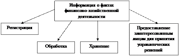 В бухгалтерском учете обеспечиваются регистрация, обработка и хранение информации о фактах финансово-хозяйственной деятельности (схема 1).