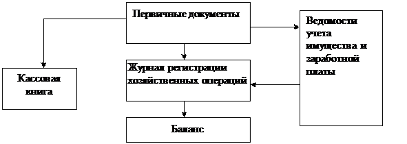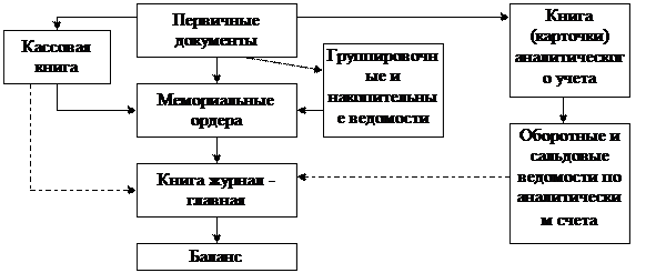 На предприятиях с небольшим документооборотом и объемом обрабатываемой информации используются упрощенные формы учета. Старейшей из них является журнал-главная (американская) форма, описанная в 1802 году. Используется в Республике Беларусь на небольших предприятиях, в бюджетных учреждениях, колхозах и т. д. Основным регистром является книга журнал-главная (схема 29). Записи в нее делаются на основании мемориальных ордеров, составленных по однородным первичным документам. При наличии большого количества первичных документов их предварительно объединяют в группировочных ведомостях, итоги которых служат основанием для составления соответствующих мемориальных ордеров. В конце месяца по книге журнал-главная подсчитывают итоги.