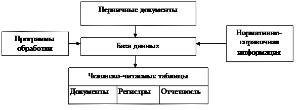 Информация, вводимая в компьютер из первичных документов, с помощью специальных программ и уже имеющейся в памяти ЭВМ нормативно-справочной информации обрабатывается. На ее основе формируются соответствующие базы данных. При запросе бухгалтера эти данные могут быть представлены в виде электронных таблиц на мониторе, а также распечатаны в форме отдельных документов, регистров по тому или иному счету, отчетности за определенный период.