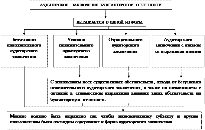По результатам проведенной проверки аудиторская фирма должна выразить мнение о достоверности бухгалтерской отчетности организаций. Мнение может быть выражено в форме безусловно положительного, условно положительного или отрицательного аудиторского заключения (схема 31).