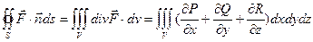 Теорема: если функции P(x,y,z), Q(x,y,z), и R(x,y,z) - непрерывны вместе со своими частными производными первого порядка в ограниченной замкнутой области, имеющей объем V, то имеет место формула Остроградского-Гаусса.