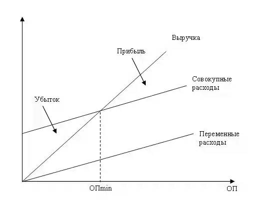Точка безубыточности (ОПmin) — это такой объем продаж, при котором выручка покрывает все затраты предприятия на производство и реализацию продукции. Тем самым безубыточность — это такое состояние, когда бизнес не приносит ни прибыли, ни убытков.