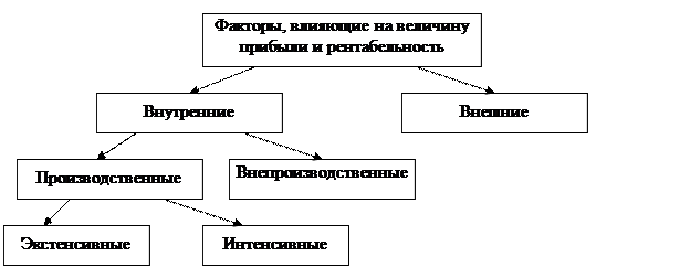 Внутренние факторы делятся на производственные и вне-производственные. Производственные факторы характеризуют наличие и использование средств и предметов труда, трудовых и финансовых ресурсов и в свою очередь могут подразделяться на экстенсивные и интенсивные. Экстенсивные факторы воздействуют на процесс получения прибыли через количественные изменения: объема средств и предметов труда, финансовых ресурсов, времени работы оборудования, численности персонала, фонда рабочего времени и др. Интенсивные факторы воздействуют на формирование и увеличение прибыли, повышение рентабельности через "качественные" изменения: повышение производительности оборудования и его качества, использование прогрессивных материалов, совершенствование технологии обработки, ускорение оборачиваемости оборотных средств, повышение квалификации и производительности труда персонала, снижение трудоемкости и материалоемкости продукции, совершенствование организации труда и более эффективное использование финансовых ресурсов и др.