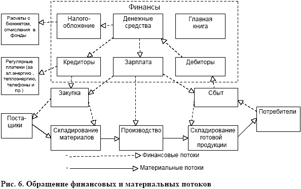 В соответствии с идеологией ERP эта подсистема полностью интегрирована со всеми остальными и позволяет оперативно получать информацию о финансовых потоках, связанных с потоками материальными (см. рис. 6), о текущем финансовом состоянии компании, и помогает находить оптимальные финансово - экономические решения. Сквозное управление материальными потоками находит свое отражение в управлении финансовыми потоками (движении денежных средств).