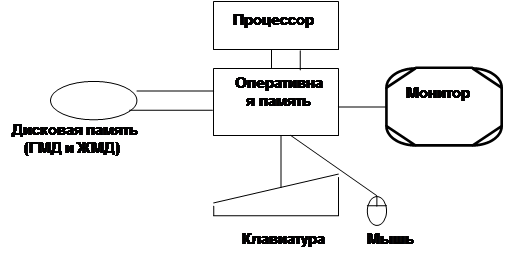 а) аппаратное обеспечение (hardware), т.е. набор устройств, таких как процессор, память, клавиатура, мышь, монитор, управление дисками и др., составляющих собственно компьютер.