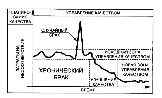 На рис. 1 приведена классическая схема, разработанная Джураном более чем 40 лет тому назад, но весьма актуальная и в наше время. Существенное различие сделано между случайными и хроническими проблемами. Случайные (внезапные) проблемы обычно регулируются и решаются в рамках текущего управления процессом. Распределение обязанностей и ответственности по принятию контрольных мер и введению корректирующих мероприятий обычно достаточно хорошо определено.