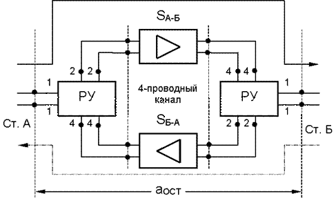 Затухание сигналов между линейными зажимами станций А и Б называется остаточным затуханием двухпроводного канала аОСТ = а1-2 - SА-Б(Б-А) + a4-1. Желательно, чтобы а1-2 и a4-1 были минимальны.