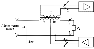 В качестве РУ в современных системах передачи широко используется дифференциальная система (ДС), выполненная на основе симметричного трансформатора со средней точкой (Рис. 4.2) (полуобмотки II и III идентичны). В состав ДС входит сопротивление Z3, называемое балансным. Оно приближенно отражает свойства входного сопротивления абонентской линии.