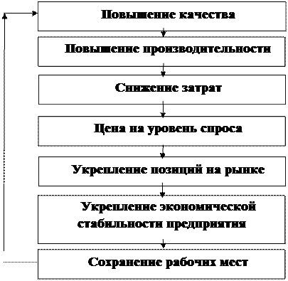 Э. Деминг представил ее в виде достаточно простой диаграммы, в которой повышение качества в конечном итоге приводит к сохранению рабочих мест, что улучшает мотивацию работников, что в свою очередь приводит к новому повышению качества и так далее в цепной реакции.