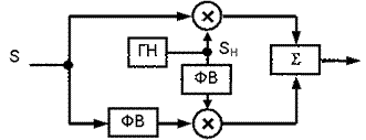 Указанные недостатки, в основном, устраняются при использовании фазоразностной схемы (Рис. 6.5). В схеме фазоразностного модулятора происходит подавление одной из боковых полос, а мощность другой боковой полосы удваивается. Недостатком данной схемы является сложность выполнения фазовращателя (ФВ) для всей полосы частот модулирующего сигнала.