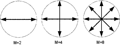 Фазовая модуляция в чистом виде не нашла практического применения из-за так называемой "обратной работы", когда при ошибке в приеме одного бита последующие за ним будут приняты инверсно. Практически применяется относительная фазовая модуляция (ОФМ), при которой информация представляется не абсолютным значением фазы, а разностью фаз несущей на двух соседних интервалах. Применяются не только двухуровневая, но и многоуровневая (4, 8 и т.д.) ФМ (Рис. 6.8).