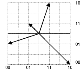 Широкое применение находит квадратурная амплитудная манипуляция (КАМ). Этот вид манипуляции, по существу, представляет собой сочетание АМ и ФМ, в связи с чем его еще называют амплитудно-фазовой манипуляцией (АФМ). В случае КАМ изменяется и фаза и амплитуда несущей. Применяются КАМ 4-го уровня и выше (КАМ-4, КАМ-16 (Рис. 6.10), КАМ-64 и т.д.), причем КАМ-4 совпадает с ОФМ 4-го уровня.