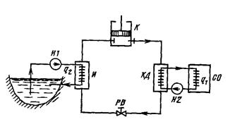 На рис. 23.12 приведена схема теплового насоса для отопления здания. Элементы схемы: компрессор К,, конденсатор КД, регулирующий вентиль РВ и испаритель И составляют обычную компрессионную холодильную установку. Испарение холодильного агента в испарителе происходит за счет теплоты, получаемой от холодной воды, и энергии, подводимой к компрессору.