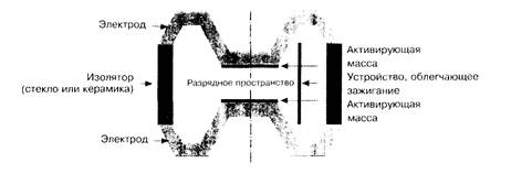 Электроды в разрядном пространстве покрыты активирующей массой. Специальные газонаполненные разрядники имеют вспомогательный электрод для зажигания (см. рис. 103). Чтобы гарантировать малый разброс разрядного постоянного напряжения, газонаполненные разрядники имеют внутри слабое радиоактивное покрытие электродов. В зависимости от типа и изготовителя достижимы токи до 40 кА (импульс 8/20 мкс).