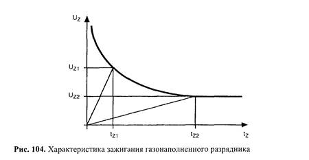 Недостатки газонаполненных разрядников связаны с характеристиками зажигания и гашением сопровождающего тока. Рис. 104 показывает напряжение зажигания в зависимости от нарастания переходного напряжения. Медленно нарастающее напряжение с крутизной примерно 100 В/с пересекает характеристику зажигания в момент tZ2 в области электрической прочности при постоянном напряжении. Напряжение пробоя обозначено через UZ2 При более быстрых переходных процессах в микросекундной области имеет место пересечение характеристики зажигания при существенно большем напряжении. На рис. 104 точка пересечения обозначена координатами tZ1 и UZ1 Это напряжение может превышать электрическую прочность разрядника при постоянном напряжении во много раз. Таким образом, газонаполненный разрядник имеет зависящую от времени характеристику зажигания. Это означает, что защитный уровень при защите от переходных перенапряжений нельзя точно сформулировать. Этот эффект объясняется тем, что для ионизации благородного газа требуется время.