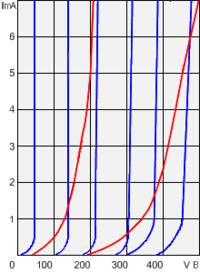 – значительный рост фиксируемого варистором напряжения Vcmax при увеличении тока. Пиковое значение фиксируемого варистором напряжения Vc в два раза больше номинального;