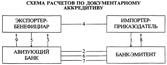 Схема аккредитивной формы расчетов сводится к следующему. Импортер представляет в банк заявление на открытие аккредитива. Банк импортера, открывший аккредитив, направляет аккредитивное письмо одному из своих корреспондентов в стране экспортера, назначая его авизующим банком и поручая ему передать аккредитив бенефициару. После получения открытого в его пользу аккредитива (как обеспечения платежа товара) бенефициар производит отгрузку товара, представляет документы, как правило, в авизующий банк, который пересылает их для оплаты банку-эмитенту. После проверки правильности оформления документов банк, открывший аккредитив, производит их оплату. Если документ соответствует условиям аккредитива, банк переводит деньги согласно инструкциям авизующего банка и выдает документы импортеру, который получает товар. Поступившая выручка зачисляется на счет экспортера. В соответствии с условиями аккредитива в качестве банка, уполномоченного на оплату документов (исполняющий банк), может быть назначен и авизующий банк, который в этом случае производит оплату документов экспортеру в момент их представления в банк, а затем потребует возмещения произведенного платежа у банка-эмитента (по непокрытым аккредитивам). Обычно если у исполняющего банка и банка-эмитента нет взаимных корреспондентских счетов, то в расчетах принимает участие третий (рамбурсирующий) банк, в котором открыты корреспондентские счета указанных банков. При открытии аккредитива банк-эмитент дает инструкции (рамбурсное полномочие) рамбурсирующему банку оплачивать требования исполняющего банка в течение срока действия и в пределах суммы аккредитива.