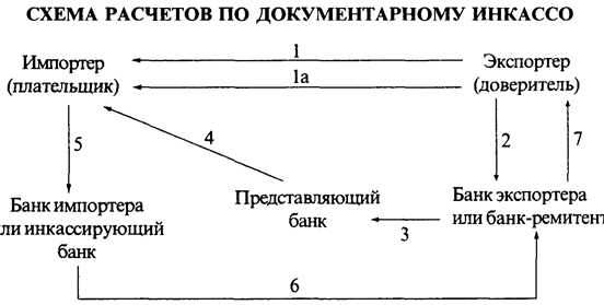 1 Экспортер заключает контракт с импортером о продаже товаров на условиях расчетов по документарному инкассо и отправляет ему товар (1а). 2. Экспортер направляет своему банку инкассовое поручение и коммерческие документы 3. Банк экспортера пересылает инкассовое поручение и коммерческие документы представляющему банку (или банку импортера). 4. Представляющий банк предъявляет эти документы импортеру. 5. Импортер производит оплату документов инкассирующему (или своему) банку 6 Инкассирующий банк переводи! платеж банку-ремитенту (или банку экспортера). 7 Банк-ремитент зачисляет переведенную сумму на счет экспортера.
