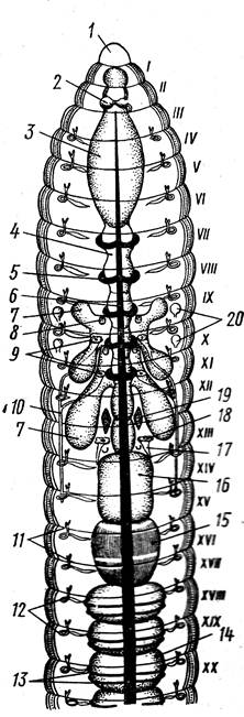 Тело длинное, червеобразное, сегментированное. Число сегментов колеблется от 5–6 до 600.