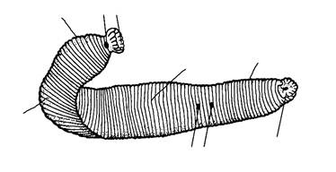 сегментация тела – гомономная (однородная), как и у олигохет. Каждому истинному сегменту соответствуют 3–5 наружных колец. Тело пиявок состоит из 30–33 сегментов, включая сегменты, образующие присоски.