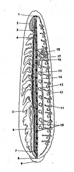 1 – церебральные ганглии, 2 – глотка, 3 – пищевод, 4 – передний карман желудка, 5 – задний карман желудка, 6 – средняя кишка, 7 – задняя кишка, 8 – анус, 9 – задняя присоска, 10 – ганглии, 11 – метанефридий, 12 – мочевой пузырь, 13, 15 – семенные мешки, 14 – семяпровод, 16 – влагалище, 17 – яйцевой мешок, 18 – пенис.
