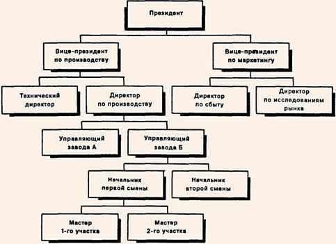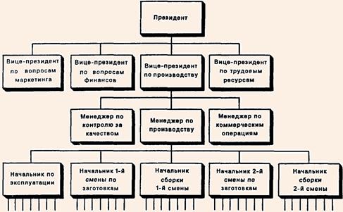 ОБЪЕМ УПРАВЛЕНИЯ. Вертикальное разделение труда, т.е. отделение работы по координации от непосредственного выполнения заданий, необходимо для успешной групповой работы. Преднамеренное вертикальное разделение труда в организации дает в результате иерархию управленческих уровней. Центральной характеристикой этой иерархии является формальная подчиненность лиц на каждом уровне. Иерархия пронизывает всю организацию, спускаясь на уровень неуправленческого персонала. Рис. 3.3. представляет пример вертикальной иерархии.
