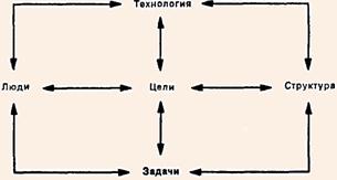 Каждая из школ управления внесла заметный вклад в понимание различных внутренних переменных, тем не менее именно развитие теории систем помогло создать концепцию организации как целостности, состоящей из взаимозависимых частей. Рис. 3.8. представляет собой модель, показывающую взаимоотношения внутренних переменных: целей, структуры, задач, технологии и людей. (В последующих главах мы расширим эту модель и включим в нее группы, лидерство и другие факторы рабочей среды.)