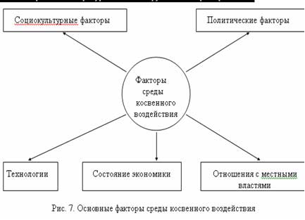 Различным будет и влияние конкретных факторов среды косвенного воздействия. Общей предпосылкой эффективного международного бизнеса является политическая ситуация в стране, где организация осуществляет свои операции. Существенное влияние на международный бизнес оказывают состояние экономики, развитие технологий. В ряде случаев, например, при экспорте определенных потребительских товаров, решающую роль могут сыграть социокультурные факторы. При размещении новых производств необходимо добиваться поддержки местных властей.