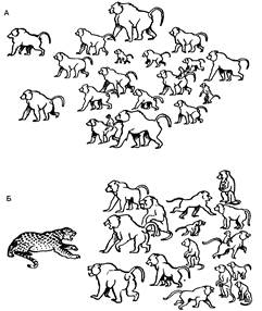 Рис. Стадо павианов на марше (А) и при возникновении опасности (Б)