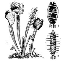 Рис. Венерина мухоловка. 1. общий вид, 2. полузакрытый лист с жертвой, 3. закрытый лист.