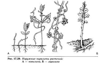 находится вне хозяина, а в него проникают лишь органы питания — присоски. Один из наиболее распространенных наружных паразитов — повилика, растущая на многих видах трав и кустарников.
