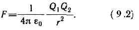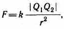 Закон Кулона: сила взаимодействия F между двумя неподвижными точечными зарядами, находящимися в вакууме, пропорциональна зарядам Q1 и Q2 и обратно пропорциональна квадрату расстояния r между ними: