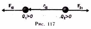где F 12— сила, действующая на заряд Q1 со стороны заряда Q2, r 12 — радиус-вектор, соединяющий заряд Q2 с зарядом Q1, r= | r 12|(рис. 117). На заряд Q2 со стороны заряда Q1 действует сила F 21=- F 12, т. е. взаимодействие электрических точечных зарядов удовлетворяет третьему закону Ньютона.