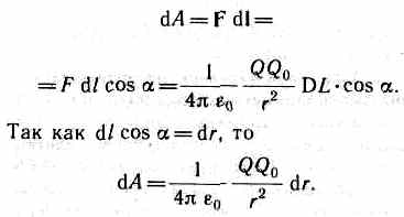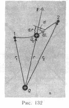 Если в электростатическом поле точечного заряда Q из точки 1 в точку 2 вдоль произвольной траектории (рис. 132) перемещается другой точечный заряд Q0, то сила, приложенная к заряду, совершает работу. Работа силы F на элементарном перемещении dl равна