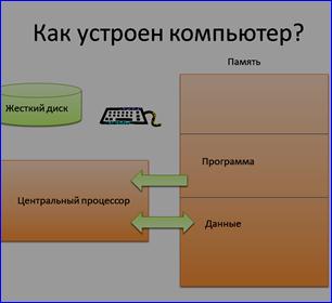 Для этого обратимся к тому, как устроен сам компьютер (Слайд 1). Нас будут интересовать две составляющие компьютера: это оперативная память и центральный процессор.