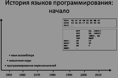 Конечно же использовать машинные коды в виде чисел было неудобно, поэтому достаточно быстро придумали называть команды с помощью некоторых англоязычных аббревиатур, которые было легче запоминать. Такой язык называется языком ассемблера (слайд 3), поскольку он позволял также помимо аббревиатуры команд не запоминать адреса некоторых областей данных, а называть их именами и затем эти адреса в процессе преобразования в машинные коды автоматически подставлять. Однако такой способ программирования был доступен только продвинутым программистам. И назывался языком низкого урвня