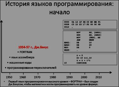 Тогда в 50-х годах (слайд 4) Джон Бэкус придумал язык Fortran (от англ. словосочетания Formula Translated – Tранслятор Формул) – язык, похожий на математический язык. Такой язык получил название язык высокого уровня.