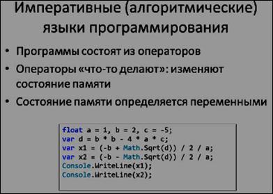 Эти языки называются также императивными языками, поскольку они состоят из набора операторов, каждый из которых что-то делает, т.е. он изменяет состояние памяти определенным образом.